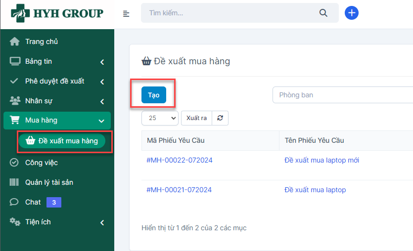 1. Truy cập menu "Đề xuất mua hàng" và bấm nút "Tạo" để tạo mới đề xuất.